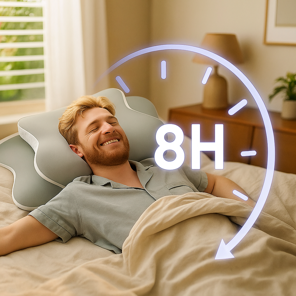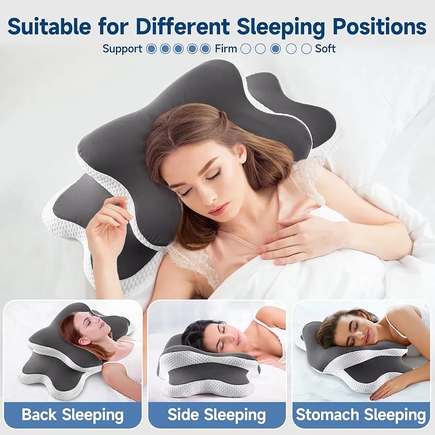 The butterfly-shaped contour keeps your head, neck, and spine aligned, reducing tossing and turning. Its breathable memory foam ensures cool comfort throughout the night. You wake up fully rested, energized, and free from stiffness.
